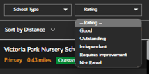 You can filter your results using the 'school type' and 'rating' drop down menus.