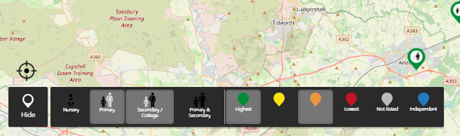 You can also use the bottom toolbar to filter the schools, the map will update in real-time