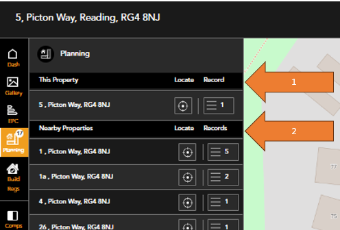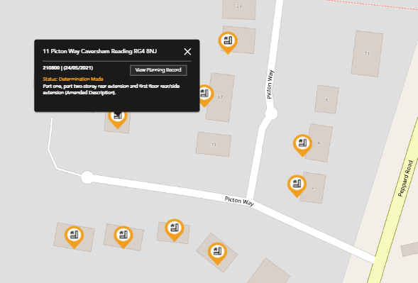 Summary details can also be seen by clicking on the property pin on the map. 'View planning record' works the same here, redirecting you to the local authority.