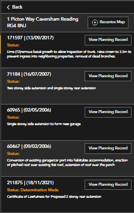 Each address in the list will have a number next to it. This number refers to the number of planning applications at that address.