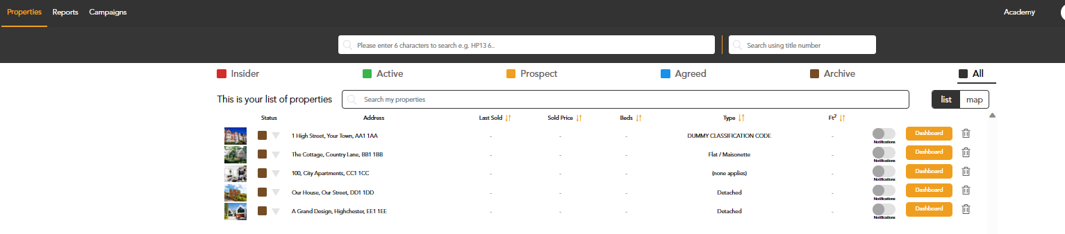 The 'My Properties' page is where all of your previously searched addresses will appear