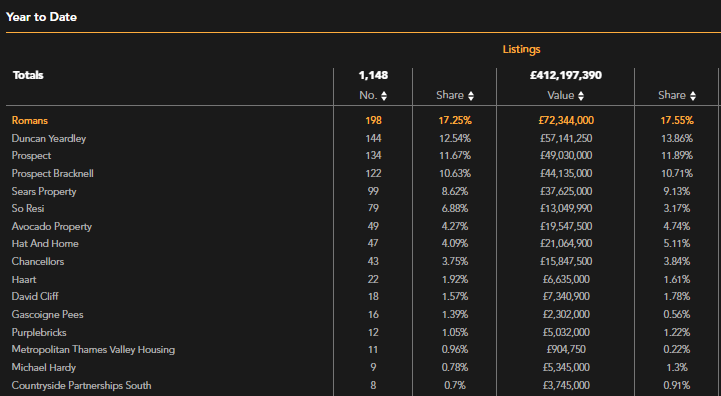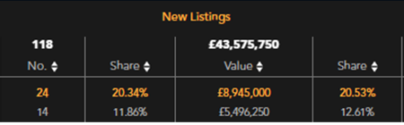 New listings shows the number of listings added by the agency since the start of the year, along with % share these account for and the total value of the listings.